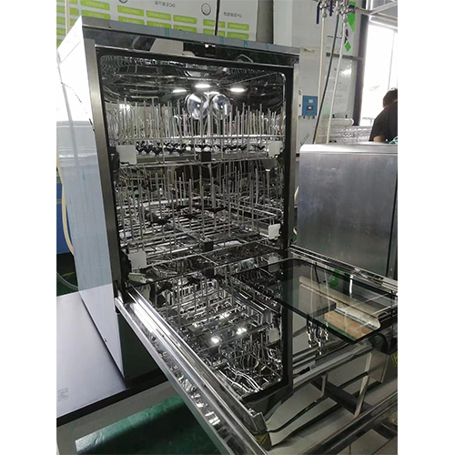 將實(shí)驗(yàn)室器皿裝載到器皿裝載籃架上通過滑軌載入清洗機(jī)內(nèi)腔中,通過清洗步驟去除器皿上的污染物(包括有機(jī)物、無機(jī)物、蛋白質(zhì)等),使器皿上的殘留物被清洗掉;通過漂洗步驟去除器皿上污染物和清洗劑殘留,使器皿上離子殘留量低于檢測下限,通過去除器皿上細(xì)胞、病毒、細(xì)菌殘留,使活微生物數(shù)量減少到規(guī)定水平。